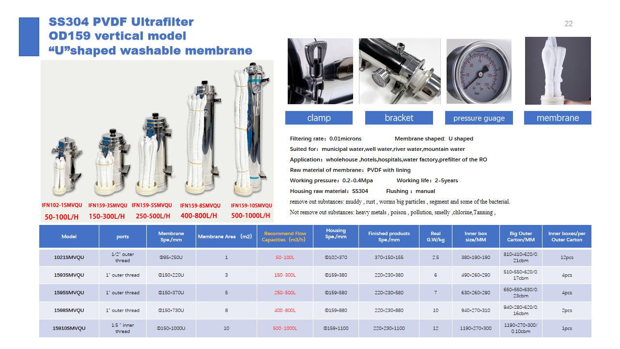 Our PVDF washable membrane filtering rate is 0.01Micron, The PVDF ultrafilter can only remove the muddy , rust , worms big particles , segment and some of the bacterial, make the cloudy water become transparent water , but it can not remove the heavy metals , poison , pollution, smelly ,chlorine,Tanning , if need to be solved these problems , need to add some other filters , such as carbon filter , or RO ,or chemicals filtration.